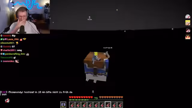 07:36:47Es wird ein Risiko eingegangen, um zu testen, ab wann der Ghast Schaden nimmt, wobei Paul sofort hochfliegen soll, wenn es passiert. Stegi schlägt vor, die Flugbahn der Enderperle zu beobachten, falls er sie nicht trifft, um dann in die Richtung zu fliegen. Die Gruppe erreicht eine perfekte Position bei minus 119 Metern. Stegi bereitet sich auf den wichtigsten Enderperlen-Wurf seines Lebens vor, muss aber erst die Perle im Inventar finden. Er stellt sich auf den Ghast, um den Wurf vorzubereiten. Kurz vor dem Wurf wird bemerkt, dass der HappyGast nicht mehr geladen ist, aber die anderen beiden Ghasts sind noch da. Nach einem Countdown wirft Stegi die Enderperle, aber die Verbindung wird zurückgesetzt, und er fällt zu schnell. Trotz der Nähe zum Ghast stirbt Stegi, da er bereits einen In-Damage-Tick hatte. Die Gruppe bedauert den Fehlschlag und bemerkt, wie schnell alles ging. Es wird ein Clip von Stegis Tod gemacht, um die Situation zu analysieren. Stegi ist traurig über das Scheitern, da er so nah dran war. Die Gruppe muss nun zur Hochzeit, die gleichzeitig mit Stegis Beerdigung stattfindet.