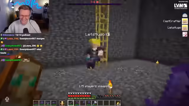 08:16:50Hugo fragt, wo das Void ist, und es wird ihm gezeigt, dass es darunter liegt. Er fragt, ob er hineinspringen kann, und es wird ihm geraten, eine Elytra zu benutzen. Heiko fragt, ob er auch hineinspringen soll, aber es wird ihm gesagt, dass er ihn retten wird. Der Adrenalinspiegel ist hoch, und es wird diskutiert, auf welcher Höhe Stegi war, als er starb. Es wird festgestellt, dass Stegi bei minus 127 Metern war, kurz vor dem Damage-Tick. Es wird ein Clip von Stegis Tod angesehen, und die Reaktionen sind emotional. Es wird diskutiert, wie Stegi gestorben ist, und es wird erklärt, dass er ohne Enderperle ins Void gesprungen ist. Es wird ein weiterer Versuch unternommen, ins Void zu springen, wobei Hugo eine Enderperle hat. Es wird besprochen, ab welcher Koordinate Damage passiert (minus 128). Hugo soll so weit wie möglich fliegen, bevor er springt. Es wird ein Spiel gespielt, bei dem Hugo die Hauptstadt von Ungarn nennen muss, bevor er teleportiert wird. Es wird ein Jump'n'Run über das Void geplant, mit Challenges und einem Ei am Ende. Der PvP-Raum wird gezeigt, der perfekt ausgehoben ist. Es wird diskutiert, ob das Ei geworfen werden soll, aber es gibt Bedenken, dass es ins Void fällt. Es kommt zu einem Streit über das Ei, und es wird ein Waffenstillstand vereinbart. Hugo soll seinen Skin ändern, und es wird über die Wirkung des Skins diskutiert. Es wird bemerkt, dass die Redstone-Signale noch reichen, und es wird versucht, einen Block abzubauen, aber es besteht die Gefahr, dass der Ghast neu lädt. Hugo fällt erneut ins Void, und es wird diskutiert, wo er reingefallen ist.