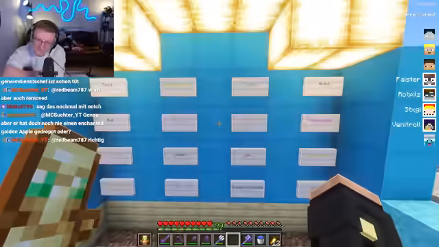 02:31:05Es werden Ideen für Sicherheitsmechanismen in einem Jump'n'Run-Parcours diskutiert, um Cheaten zu verhindern. Eine Möglichkeit wäre, Sky-Sensoren in die Wände einzubauen, die auf bestimmte Aktionen wie Fliegen mit Elytra, Trinken von Tränken oder das Benutzen von Enderperlen reagieren. Bei unerlaubten Aktionen könnte sich eine Tür am Ende des Parcours schließen oder die Blöcke des Jump'n'Runs könnten sich zurückziehen, um das Weiterkommen zu verhindern. Eine weitere, drastischere Idee ist der Einbau einer 'Railcannon', die bei Fehlverhalten des Spielers Pfeile mit hoher Geschwindigkeit abfeuert und ihn 'one-shottet', selbst durch Rüstung und Totem. Diese kreativen Fallen sollen das Jump'n'Run zu einer echten Herausforderung machen und unerlaubte Abkürzungen unterbinden.