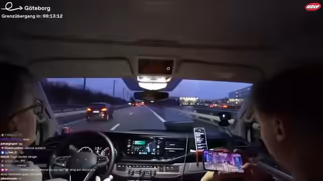 05:26:13Einem Viewer zufolge wurde das Auto an einer Abfahrt mit einem Schild kontrolliert, was zu Spekulationen über eine eventuelle Strafe oder Kontrolle führt. Im Auto werden verschiedene Dokumente und Informationen angepinnt, darunter eine Liste mit der Anzahl der täglichen Bestellungen und ein Hinweis auf Text-to-Speech-Funktionen. Am schwedischen Grenzübergang kommt es zu einem konkreten Zwischenfall: Ein Fahrzeug versucht, am Stau vorbeizufahren und wird dabei von den Einsatzkräften gestoppt, was im Chat für große Aufregung sorgt. Nachdem die Grenze passiert ist, stellt das Team fest, dass sie direkt in einen schweren Verkehrsunfall mit mehreren beteiligten Fahrzeugen und Einsatzkräften hineingefahren sind, der zu einem langen Stau führt.