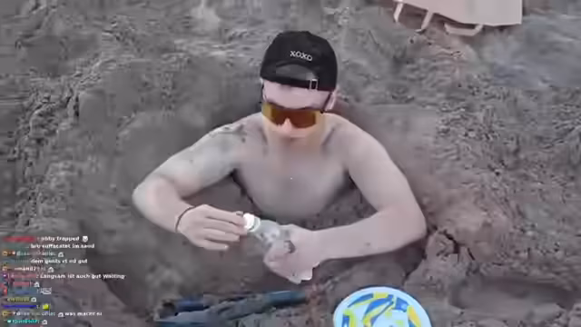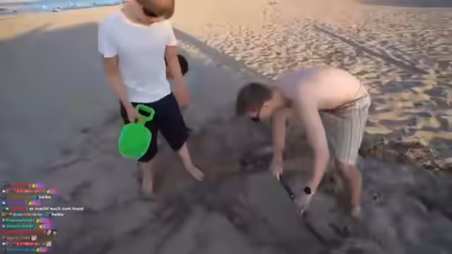 03:56:23Nach dem Volleyballspiel wechseln die Streamer die Aktivität und beschließen, ein großes Loch im Sand zu buddeln. Moritz übernimmt die Rolle des erfahrenen "Buddel-Experten" und gibt Anweisungen für die effektivste Vorgehensweise. Die Gruppe arbeitet motiviert daran, eine große Fläche freizulegen und die hellen Sandschichten zu entfernen, um einen stabilen Bereich für ihr Vorhaben zu schaffen. Dieses gemeinschaftliche Ziel schweißt die Gruppe zusammen.