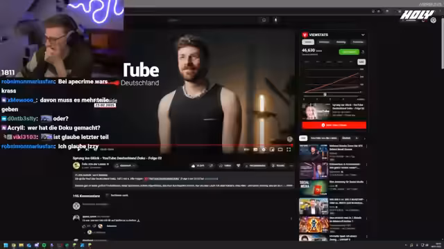 02:33:15Der Streamer techt Anekdoten aus der YouTube-Geschichte. Er erwähnt, wie die Fensterrahmen des YouTube-Hauses aufgedeckt wurden, und spricht über sein früheres Leben, das Konzerte von sich und die „Lochis“. Er zeigt sich begeistert von der YouTube-Doku, die Projekte wie Gronkh, Dena, Rewe und Aaron Troschke behandelt, und wünschte sich, diese sei offiziell von YouTube gewesen.
