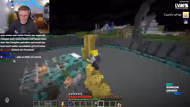 04:22:38Nach unzähligen Anläufen und teils frustrierenden Fehlschlägen beim Testen der Ghast-Falle, scheint der Durchbruch gelungen zu sein. Der Streamer meldet begeistert: 'Endlich sammelt er. Endlich sammelt er. Ist das geil.' Die Maschine scheint zu funktionieren. Doch die Freude ist nur von kurzer Dauer, denn kurz darauf stellt er fest, dass der Ghast das Boot in der Falle aus irgendeinem Grund komplett verschoben hat. Dies führt dazu, dass die gesamte Konstruktion neu justiert werden muss, was den Erfolg in Frage stellt.