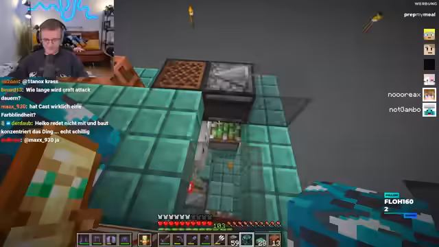 02:50:48Zu Beginn des Chunks herrscht Verwirrung über die Verfügbarkeit seltener Items wie des Villager-Eyes und eines Command-Blocks. Der Streamer findet es bemerkenswert, wie früh ein Spieler ein solches seltenes Item in der Hand hielt. Als Chat-Mitglieder das Vorhandensein eines Command-Blocks bestätigen, erläutert der Streamer, dass er zwar einen in seiner Basis hat, diesen jedoch nicht bedienen kann, weil er die notwendigen OP-Rechte (Operator-Privilegien) nicht besitzt. Diese fehlenden Berechtigungen erschweren den Umgang mit wichtigen Werkzeugen.