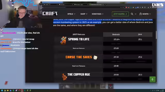 03:08:17Ein wichtiges Thema ist die Änderung im Minecraft-Versionierungs-System, die auf 'Game Drops' umgestellt wird. Statt einer einzigen Hauptnummer wie 1.22 gibt es jetzt häufigere Updates mit spezifischeren Nummern, z.B. 25.1, 25.2 usw. Die 'Mines of Mayhem'-Update wird die Version 25.4 erhalten. Dies soll die Verwirrung bei kleineren Updates reduzieren und für mehr Klarheit bei Spielern und Creatern sorgen. Der Streamer findet dieses System zunächst etwas gewöhnungsbedürftig, erkennt aber den Vorteil, dass Big Updates nicht mehr gezwungenermaßen die Hauptnummer erhöhen müssen.