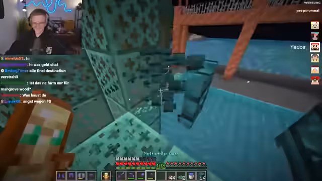07:38:07Beim Testen der automatisierten Netherholz-Farm stellt der Streamer ein Problem fest. Die Farm benötigt Fungus zum Weiterbetrieb, der jedoch nicht automatisch recycelt wird. Er muss die recycelten Blöcke manuell abbauen und austauschen, um die Farm am Laufen zu halten, was den Prozess ineffizient macht.