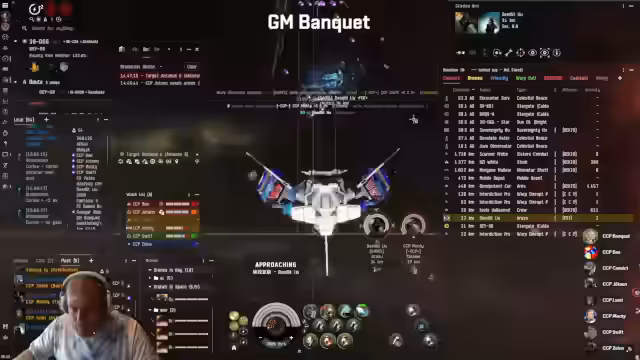 01:32:34Die Spannung steigt, als eine massive feindliche Flotte, bestehend aus Einheiten wie Cyclone, Bargus und Gnosis, auftaucht. Es kommt zu einem Zusammenstoß, bei dem die eigene Flotte gezwungen ist, sich zurückzuziehen. Die Situation wird noch komplizierter durch das Auftauchen weiterer Gegner, was zu einem chaotischen Gefecht führt, in dem selbst der 'König' ins Visier genommen wird.