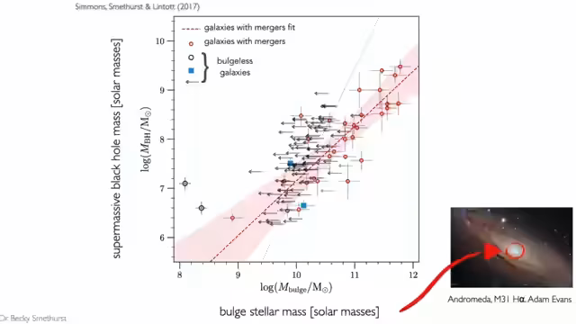 05:12:14Es wird die Frage aufgeworfen, wie Schwarze Löcher zu supermassiven Objekten heranwachsen können, die Millionen oder Milliarden Mal schwerer als die Sonne sind, obwohl die Entstehung von Schwarzen Löchern typischerweise mit Supernovae verbunden ist, die Schwarze Löcher von nur 3 bis 100 Sonnenmassen erzeugen. Das Wachstum eines Schwarzen Lochs erfordert die Ansammlung von Materie, was jedoch erschwert wird, da die meiste Materie im Universum andere Objekte umkreist. Selbst wenn die Sonne zu einem Schwarzen Loch gleicher Masse würde, würden die Planeten ihre Umlaufbahnen beibehalten. Um Materie in ein Schwarzes Loch zu befördern, muss Energie abgeführt werden, um die Umlaufbahn zu verändern. Es wird erklärt, dass Galaxien in der Regel ein supermassives Schwarzes Loch im Zentrum haben, um das Sterne kreisen. Ein chaotischer Zusammenstoß zweier Galaxien kann diesen Prozess auslösen, indem Energie ausgetauscht und Materie ins Zentrum gelenkt wird, wodurch die Spiralstruktur der Galaxien zerstört wird und chaotische Umlaufbahnen entstehen. Dieser Prozess führt zur gleichzeitigen Zunahme der Masse der Galaxie und des Schwarzen Lochs. Allerdings haben nicht alle Galaxien eine Verschmelzung erlebt, was die Frage aufwirft, wie supermassive Schwarze Löcher in Galaxien ohne zentrale Ausbuchtung entstanden sind.