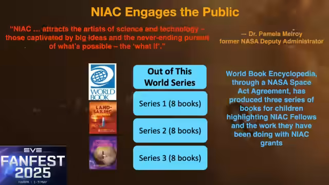 01:57:11Ron Turner, ein Auftragnehmer, spricht über das NASA Innovative Advanced Concepts (NIAC) Programm. Er bedankt sich bei den EVE-Organisatoren für die Einladung und erzählt von seiner Kindheit an der Space Coast in Florida, wo er alle Apollo-Starts miterlebte. Er teilt seine persönliche Verbindung zu EVE Online, die durch seinen Sohn Tyrus Tenebron begann. Er beschreibt seine Anfänge im Spiel im Jahr 2009 und seine Vorliebe für den Industrie-Aspekt. Turner erklärt, dass NIAC frühe Innovationen finanziert und das Ziel hat, das Mögliche in der Luft- und Raumfahrt zu verändern. Das Programm sucht nach aufregenden, potenziellen Durchbrüchen, die noch unerforscht und glaubwürdig sind und in einer Referenzmission angewendet werden können. Ein ideales NIAC-Projekt löst zunächst Begeisterung aus, gefolgt von Skepsis. Ein Video verdeutlicht die Essenz von NIAC, indem es zeigt, wie Science-Fiction die Grundlage für zukünftige Technologien legt. NIAC finanziert visionäre Konzepte von diversen Quellen und unterstützt Wissenschaftler und Ingenieure. Das Programm zielt darauf ab, die Zukunft zu transformieren und die Grenzen des Möglichen zu erweitern, um NASA bei der Gestaltung des nächsten Kapitels der Weltraumforschung zu helfen. NIAC wird als NASA's 'Dream Shop' bezeichnet, die sich mit Ideen befasst, die über das Übliche hinausgehen.