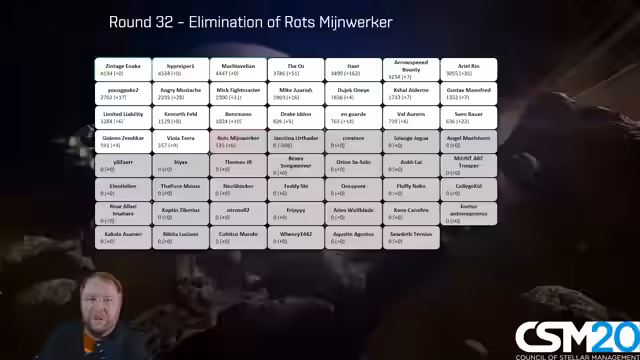 01:38:55Nach 51 Runden des STV-Verfahrens ist das endgültige CSM20-Rennen beendet. Gewählt wurden Zintic Janaka, Hyperviper, Machiavellian, The Oz, Itair, Angry Mustache, Young Puke, Ariel Wren, Arrow Speed Bounty und Kashal Adron. Um die Diversität zu erhöhen, wählte CCP zusätzlich Mick Fightmaster und Val, um Wormhole- und Small-Gang-Gameplay zu repräsentieren. Das gesamte CSM20 umfasst somit 12 Mitglieder. Die Zusammenarbeit mit dem neuen CSM beginnt sofort und wird im neuen Jahr mit einem Gipfeltreffen in Reykjavik intensiviert.