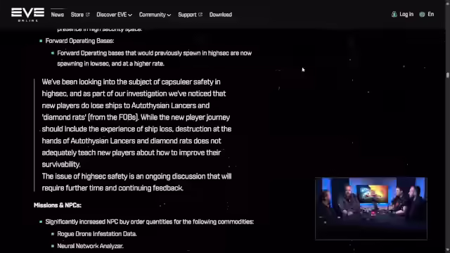 01:54:04Es wird angekündigt, dass es nun möglich ist, das Geschlecht des Charakters im Spiel zu ändern. Jeder Spieler, auch Alpha-Accounts, erhält 15.000 Skillpunkte und einen Character Resculpt Token im New Eden Store. Diese Änderung wurde von Spielern und dem CSM seit Jahren gefordert. Im Bereich Capsulear Safety werden Autothysian Lancers und Diamond Rats aus Highsec entfernt, um neuen Spielern ein faireres Spielerlebnis zu ermöglichen. Diese NPCs haben oft zu unerwarteten Schiffsverlusten geführt. Auch die Forward Operating Bases (FOBs) werden aus Highsec entfernt und in Lowsec platziert, was von vielen Spielern begrüßt wird. Abschließend wird eine Anekdote über ein Meme erwähnt, wonach Lancers Spieler mit Leichen im Frachtraum angreifen würden, was jedoch widerlegt wird.