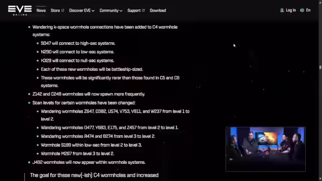 02:08:11Es wird erwähnt, dass Skyhooks nun remote konfiguriert werden können, was eine praktische Verbesserung darstellt. Die Diskussion verlagert sich zu Wormholes, wobei die neuen Wormhole-Verbindungen und -Typen thematisiert werden. C4-Wormholes werden als besonders interessant hervorgehoben, da sie nun auch normale Verbindungen zum K-Space (Known Space) haben können. Es wird erklärt, was K-Space und W-Space (Wormhole Space) bedeuten und warum der Begriff J-Space vermieden wird. Die neuen Wormhole-Verbindungen sollen mehr Content generieren, auch wenn einige Wormholer dies kritisch sehen. Abschließend wird die Nachricht über Drifter Holes in Wormholes erwähnt, die nun besser im Spiel angezeigt werden.