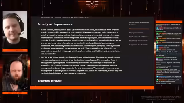 00:02:09Der Stream beginnt mit technischen Schwierigkeiten, die jedoch behoben werden konnten. CCP Jotun begrüßt die Zuschauer zusammen mit CCP Paragon. Es wird der Start von Cycle 3 in EVE Frontier bekannt gegeben, der mit einem Universe Wipe einhergeht, was bedeutet, dass alle Spieler in einem leeren Universum neu beginnen. Zudem startet der Remnant Access, der es ermöglicht, das Spiel für 10 Tage kostenlos zu spielen. Zwischen Cycle 2 und Cycle 3 gibt es nur wenige Änderungen, hauptsächlich im Bereich des Economy Testing. Ein besonderer Fokus liegt bereits auf Cycle 4, der als großes Content-Update geplant ist und neue Systeme sowie überarbeitete Inhalte bringen soll. Es wird hervorgehoben, dass die Entwicklung von EVE Frontier auf einem White Paper basiert, das als eine Art Mission Statement dient und die langfristige Vision des Spiels umreißt. Das White Paper definiert das Ziel, dass Spieler als Individuen in der Simulation agieren, was bedeutet, dass Multiboxing nicht erwünscht ist. Stattdessen soll der Fokus auf der Identität jedes einzelnen Spielers liegen und die Frage aufgeworfen werden, was die Spieler in der Spielwelt wirklich sind.