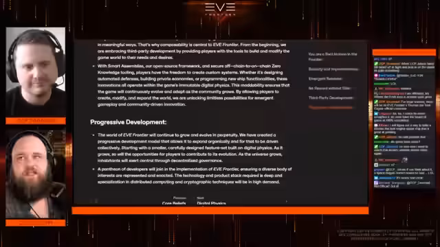 00:26:39Es wird diskutiert, inwieweit Elemente aus EVE in EVE Frontier übernommen werden. Es wird klargestellt, dass EVE Frontier weniger etablierte Strukturen und Komforts bieten wird als das etablierte New Eden in EVE. Stattdessen soll der Fokus auf Realismus und wissenschaftlichen Prinzipien liegen, um einzigartige Spielsysteme zu schaffen. Die Third-Party-Entwicklung spielt eine wichtige Rolle, wobei das Ziel ist, es Spielern ohne Programmierkenntnisse zu ermöglichen, Funktionen zu erstellen und das Spiel zu modifizieren. Es wird betont, dass die Blockchain-Technologie und Modding-Funktionen nicht erfordern, dass die Spieler Programmierexperten sind. Stattdessen sollen soziale Werkzeuge und Schnittstellen bereitgestellt werden, die es auch weniger technisch versierten Spielern ermöglichen, das Spiel zu gestalten und zu erweitern. Die progressive Entwicklung des Spiels soll es ermöglichen, dass es organisch wächst und sich kollektiv weiterentwickelt.