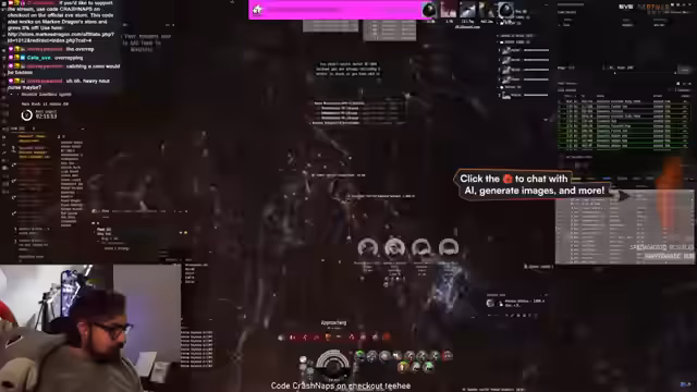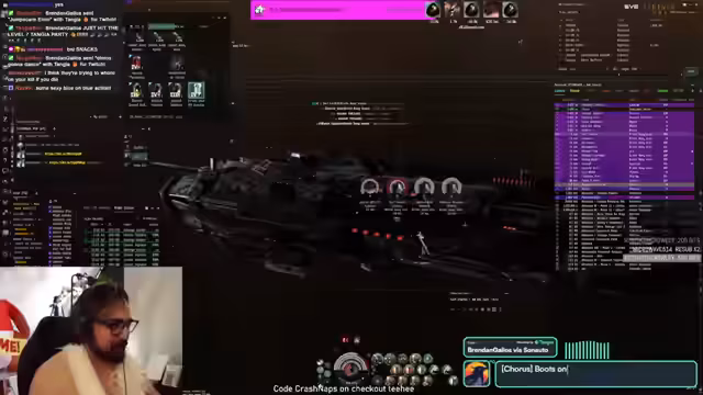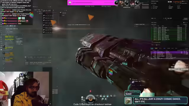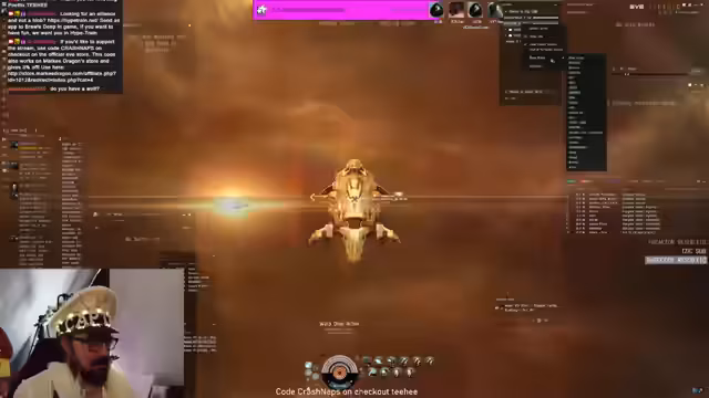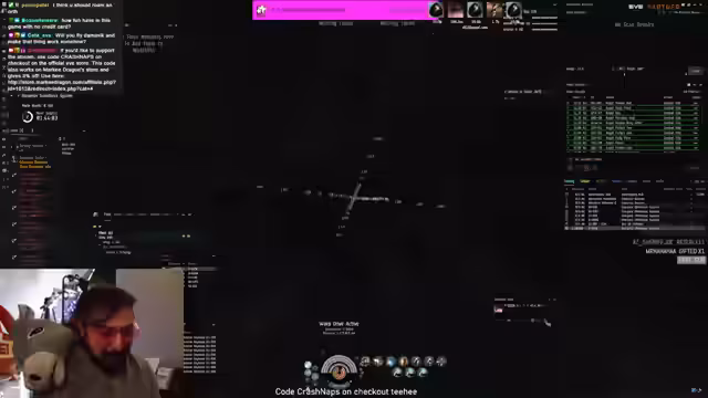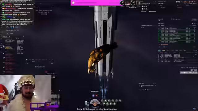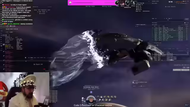 00:18:00Es wird eine starke Interaktion mit dem CCP-Chat deutlich, in dem sowohl Memes als auch Spam geteilt werden. Der Streamer erwähnt, dass er einen speziellen In-Game-Kanal namens CrashNapsSpacePub gegründet hat, um Feedback zu Schiffsfits zu erhalten. Als zentrales Event des Streams kündigt er ein kontinuierliches Giveaway an. Das Prinzip besteht darin, dass sein Schiff zerstört wird und die Zuschauer durch Teilnahme an einer Verlosung eine Belohnung erhalten.