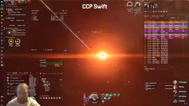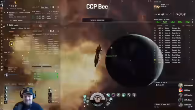 00:28:07Nach dem Verlust von Pavonio gerät die Crew in eine Serie von Begegnungen mit anderen Spielern. Eine Verfolgungsjagd durch verschiedene Systeme beginnt, bei der sie unter anderem einen Drake, einen Blackbird und eine Caracal angreifen und mit Hilfe von Punkt- und Web-Waffen sowie Überhitzung zum Schiffswrack machen. Die Crew agiert koordiniert und nutzt ihre Stärke im Bumpen und im Festhalten von Zielen, auch wenn sie dabei mehrfach Stationstürme auf sich ziehen müssen.