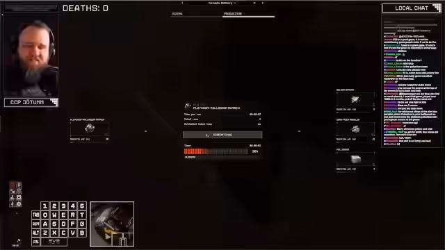 00:12:03Der Fokus liegt auf der Ressourcenbeschaffung und dem Bau einer Basis. Es werden Strategien zum Verlassen des Startsystems diskutiert. Ein Killcounter für Tode wird eingerichtet. Unter Verwendung von Portabelrefinery und Lager wird eine Raffinerie und ein Lagerplatz für D1-Treibstoff und Materialien wie Hydrated Sulfide Matrix und Feldspar errichtet. Das Interface wird gelobt. Es folgen Erklärungen zur Ressourcenverarbeitung und dem Bau von Portabelspeichern. Diskussion über zukünftige Features wie Drohnen für automatisierte Ernte und langfristige Pläne für Explorationsaspekte und Basisbau mit Grundstücksnutzung.