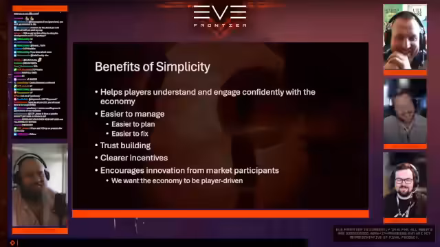 00:07:44CCP Kalair, der neue Head of Economy für EVE Frontier, wurde vorgestellt. Er kommt von der Zentralbank Islands und arbeitet seit Dezember bei CCP. Seine Aufgabe ist es, einen robusten wirtschaftlichen Rahmen für das Spiel zu entwickeln, der für Jahrzehnte Bestand haben soll. Der wirtschaftliche Rahmen basiert auf mehreren Säulen: Einfachheit, Vertrauen, Token-Nutzung, Nachhaltigkeit und Spieler-orientierung. Besonders wichtig ist die Einfachheit, um Komplexität zu vermeiden und Fairness zu gewährleisten.
