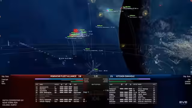 02:59:11Das Match zwischen Minmatar Fleet Alliance und Kitchen Sinkhole endet mit einer großen Überraschung. Kitchen Sinkhole tritt mit einem als meta geltenden Setup an, während Minmatar Fleet Alliance mit nur neun Spielern und einer Tripel-Golem-Komposition eine unkonventionelle Strategie verfolgt. Der Kommentar lobt die clevere Ausführung der Underdogs, insbesondere die Rolle des Blackbirds, der effektiv durch Jamming den Druck auf die Gegner reduziert und deren Kapazitätsübertragungen unterbricht. Kitchen Sinkhole hingegen agiert planlos und scheitert daran, die hohe Selbstreparatur der Golems zu durchbrechen, was den Sieg der unterlegenen Mannschaft besiegelt.