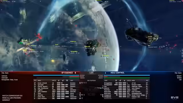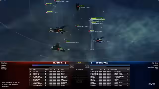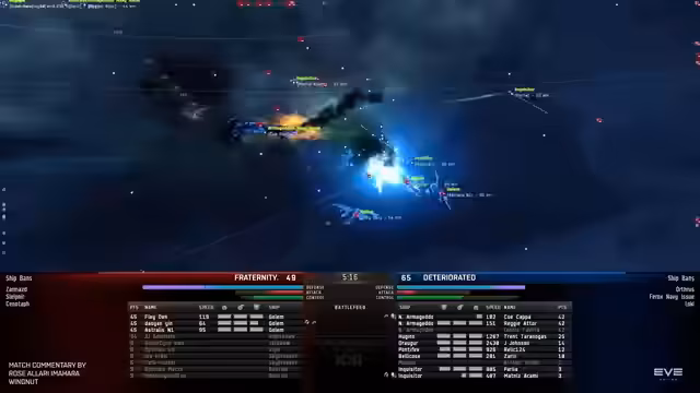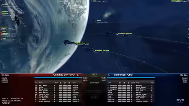 00:59:04Eine Seite tritt mit einer bekannten Potato Salad Triple Dominix Komposition an, die exakt der vorherigen entspricht. Die andere Seite setzt auf eine Doppel Armageddon Formation mit Control Arbitrators. Essence' Setup mit Ashmu, Pontifex, Eos in der Mitte und Doppel Vexor/Inquisitor wurde bereits früher gesehen. Ein pinkfarbener Geddon lenkte von der Suche nach Waffen ab. Die Geddons sind auf Utility ausgelegt, wahrscheinlich mit Noots, während die Dominix auf Drohnen setzen. Ein Match beginnt mit dem sofortigen Aussetzen von Bouncern. Ein Aniris wird sofort angegriffen, was seine Bewegungsfreiheit einschränkt. Der Geddon von Jeter fliegt direkt auf die Sentry Drones zu, um sie möglicherweise mit Smart Bombs auszuschalten. Ein Smart Bomb wird eingesetzt, um die Sentry Drones zu eliminieren. Die Geddens nutzen ihre Newts mit großer Reichweite, um die Inquisitoren auszuschalten. Die Dominixe setzen Smartbombs ein, was zu einer Schlacht der Tanks führt, da beide Seiten keine durchschlagende Wirkung erzielen. Die Dominixe versuchen, Kurok mit Smart Bombs zu schützen, während die Gedden in Reichweite sind. Ein Dominix MJD'd aus der Arena, nachdem er von einem freundlichen EOS gestoßen wurde.