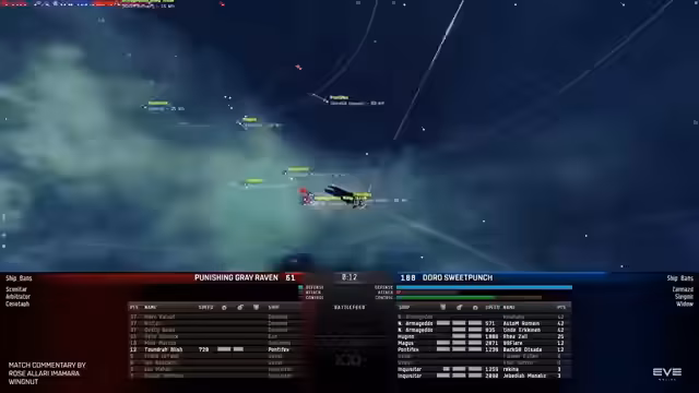 00:22:35Nach dem Verlust des ersten Dominix gerät Punishing Grey Raven in Bedrängnis, da Doro Sweet Punch weiterhin über drei Schlachtschiffe verfügt. Die Kommentatoren betonen, wie wichtig es für Punishing Grey Raven ist, die Ziele präzise auszuwählen, um eine Chance auf den Sieg zu haben. Der Verlust weiterer Inquisitoren und Vexors verschärft die Situation für Punishing Grey Raven, während Doro Sweet Punch die verbleibenden Schiffe des Gegners neutralisiert. Die Dominix-Schiffe von Doro Sweet Punch erweisen sich als widerstandsfähig, trotz des Einsatzes von Newts durch die gegnerischen Schiffe. Die Kommentatoren analysieren die Effektivität der verschiedenen Schiffe und Strategien, wobei der Fokus auf der Schadenswirkung der Rapid Heavy Missiles und der Bedeutung der Logistik liegt. Am Ende setzt sich Doro Sweet Punch durch, was Misty's Vorhersage bestätigt. Die Triple Geddon Navy Formation erweist sich als erfolgreich und wird als potenziell meta-verändernd angesehen. Abschließend wird die Bedeutung von Teamwork und strategischer Zielauswahl für den Ausgang des Spiels hervorgehoben.