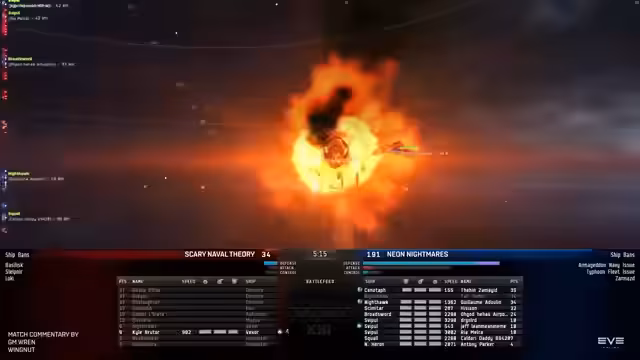 01:44:26Der Cenotaph-Pilot scheint seine Rolle zu genießen, da er mit einem einzigen Knopfdruck Schaden verursacht und sich dann zurückzieht. Der Cenotaph hat einen guten Lauf und trägt das Neon Nightmare Team maßgeblich. Der Einsatz eines Cenotaph gegen Schiffe mit vielen Trefferpunkten erweist sich als kluge Entscheidung. Ein Vexil wird zerstört und der Cenotaph-Pilot versucht, einen Rekord in einem Squall aufzustellen, was als sehr ambitioniert angesehen wird. Neon Nightmares haben sich in das Alliance Tournament vorgekämpft. Die Cenotaph ist offen, was Teams dazu verleitet, Schlachtschiffe zu wählen, was jedoch riskant ist. Die Breacher-Pods des Cenotaph verursachen entweder 1% der Hitpoints als Schaden oder maximal 1.000 Schaden. Im Turnierformat kann der Cenotaph diesen Schaden auf mehrere Schiffe verteilen, was dazu führt, dass Teams auseinanderfallen.
