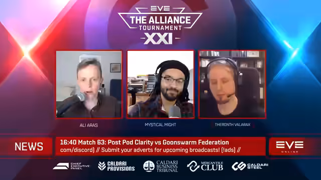 01:52:44Es wird auf den Tod von Tali und Kaldari Daddy hingewiesen, wobei letzterer einen "Edge of Glory"-Versuch unternimmt, um das Innere der Arena zu zeigen. Die Funktionsweise der Microjump-Beacons und die Kill-Boundary von 125 Kilometern werden erklärt. Es wird erwähnt, dass es schwierig sein kann, den Überblick zu behalten, wenn man gleichzeitig versucht, Entfernungen zu prüfen und Module zu überhitzen. Vor der Pause steht noch ein Match zwischen PostPodClarity und GoonSwarmFederation an. Die Bans werden als "vanilla" bezeichnet, mit Ausnahme einiger Überlegungen am Ende. Es wird spekuliert, dass Postbot Clarity möglicherweise drei Armageddon-Navy-Schiffe einsetzen wird. Die Armageddon-Navy-Schiffe waren in früheren Turnieren aufgrund der Punktinflation-Regeln schwach, aber in diesem Turnier sind sie möglicherweise stärker. Es wird gehofft, dass es wieder mehr Kontrolle zu sehen gibt, da dies die besten Matches hervorbringt.