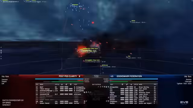 01:59:00Das Match zwischen Goon Swarm Federation und PostPodClarity beginnt. Goon Swarm Federation hat in der Vergangenheit an vielen Turnieren teilgenommen. Es wird spekuliert, dass Goons gelernt haben, wie man richtig überhitzt. Die Teams betreten die Arena. PostPodClarity setzt auf ein Triple Armageddon Navy-Setup, während Goon Swarm Federation eine gemischte Drohnen-Komposition mit einem Pilgrim einsetzt. Die Armageddons werden wahrscheinlich schwere Newts und möglicherweise Smart Bombs einsetzen. Der Pontifex wird auf Null platziert. Die Armageddons setzen schwere Reparaturdrohnen zur Unterstützung des Ponti ein. Die einzigen Schadensquellen sind die Rapid Heavies. Es wird vermutet, dass die Arbitrator und Pilgrim von Goon Swarm Federation möglicherweise vollständig mit Guidance Disruptors ausgestattet sind, um den Schaden der Armageddon Navies zu reduzieren.