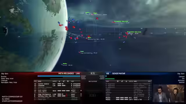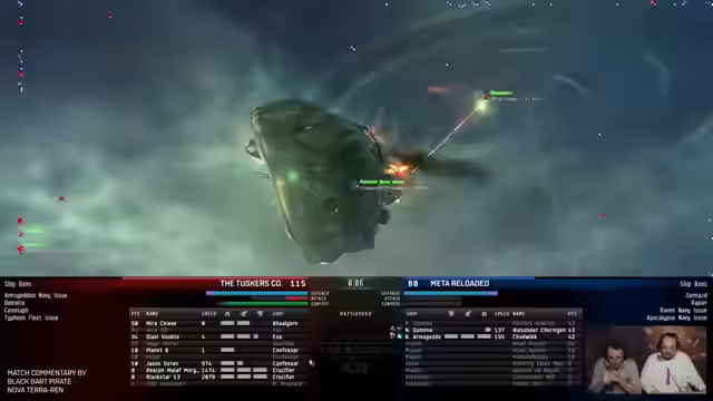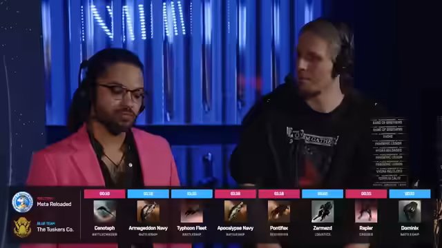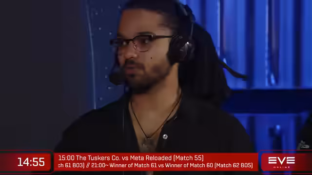 09:00:13Angesichts des 2-0 Standes und bevorstehenden dritten Matches analysieren die Experten die Banns und strategischen Optionen. Meta Reloaded hat den Pontifex gebannt, was die Tuskers zwingt, alternative Kommandoschiffe wie den Stork oder Bifrost zu nutzen, wenn sie einen Command Desi einsetzen wollen. Die Experten vermuten, dass Meta Reloaded auf ein drone-heavy Comp mit der Eos setzen könnte, während die Tuskers wahrscheinlich ihren Enigma-Comp, ein Hochausführungskonzept, oder den Raven-Navy Torp-Comp, falls verfügbar, für das entscheidende dritte Match einbringen werden.