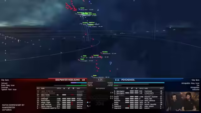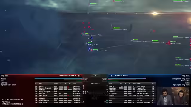 03:14:25Das nächste Match zwischen Paper Numbers und Psycho Kids beginnt. Interessanterweise wurde der Zarmaz, eines der beliebtesten und meistgebannten Schiffe, in diesem Match nicht gebannt, was zu einer ungewöhnlichen Komposition führt. Beide Teams setzen auf einen 'Spam'-Ansatz mit dem Zarmaz, aber mit unterschiedlichen taktischen Fokussierungen. Psycho Kids verfolgt eine Kiting-Taktik, während Paper Numbers direkt in den Nahkampf geht. Die Kommentatoren heben hervor, dass die Kontrolle des Logistik-Schiffs Zarmaz für den Sieg entscheidend sein wird, da beide Teams stark von seinen Reps abhängen.