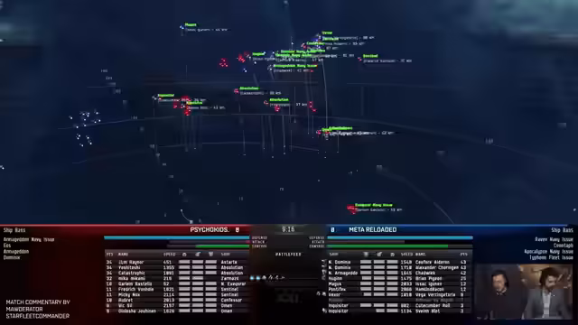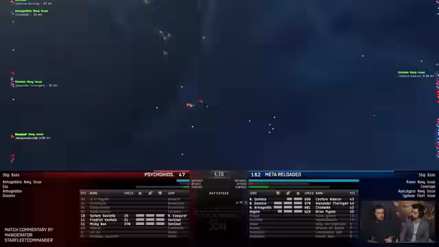 03:53:32Das Match beginnt mit einer ungewöhnlichen High-Threat-Komposition von Psychokids, die Navy Dominix, Navy Armageddon, Absolution und Astarte umfasst. Meta Reloaded kontert mit Navy Dominix, Navy Armageddon und zwei Inquisitoren. Die Kommentatoren bemerken, dass russische Teams wie Psychokids oft Sentinel-Fregatten bevorzugen, da diese als hervorragende Allrounder mit Neuts, E-War und Drones gelten. Es wird schnell deutlich, dass der Kampf um die Kontrolle des Raumes und das Eliminieren des gegnerischen Zarmaz entscheiden wird. Psychokids verfolgt eine aggressive Strategie, um Meta Reloaded unter Druck zu setzen und die Initiative zu ergreifen.