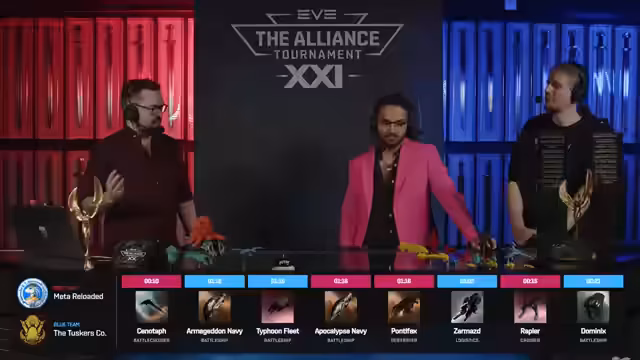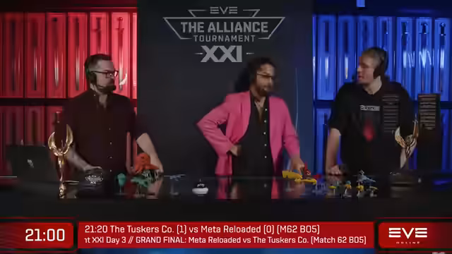 09:19:14Nach dem Ausgleichssieg von Meta Reloaded wird das entscheidende Match ausgetragen. Tuskers entscheidet sich für einen riskanten Flagship-Balgorn-Komposition, während Meta Reloaded denselben erfolgreichen Torp-Raven-Navy-Komp erneut aufstellt. Trotz des Verlusts ihres Flagships schafft Tuskers es, die gegnerischen Schiffe zu eliminieren und sich den zweiten Sieg in der Serie zu sichern, damit den Titel des Alliance Tournament 21 zu verteidigen und in die Geschichte als viertes Team mit einem Back-to-back-Sieg einzugehen.