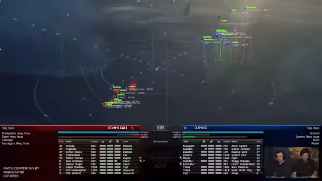 01:13:02Ein Moderator leitet das letzte Match zur Bestimmung der Top 8 ein, bei dem Odin's Call auf D-Sync trifft. Beide Teams starten mit weit auseinanderliegenden Positionen. Die Huginn-Frigatte wird als Schlüsselakteur identifiziert, da sie durch Paints und Webs die Dronenangriffe der Dominix-Blöcke ermöglichen. Während sich die Abaddon und Balgor der D-Sync-Team unter starkem Druck sehen, bemühen sich die Odin's Call-Dominix um eine Positionierung, um den Feind zu umkreisen.