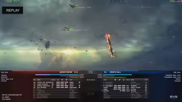 01:52:49Im Anschluss kämpfen Seeker Matar gegen das gerade geschlagene Odin's Call. Während Odin's Call versucht, mit Navy-Apochs und Sensor-Dämpfern die hoch schädlichen Golems von Seeker Matar zu neutralisieren, nutzt Seeker Matar eine clevere Strategie. Durch Cap-Transfers zwischen den Schiffen und effektive Bump-Manöver, um die Gegner auseinander zu treiben, können sie die Odin's Call-Apok vernichtend schlagen und ins nächsteziehen.