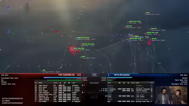 08:38:29Das zweite Finale beginnt mit einem Double-Flagship-Setup. Meta Reloaded setzt auf den Armageddon Navy Issue als Flagship, unterstützt von Dominix Navys. Ein technischer Zwischenfall führt dazu, dass ein Dominix Navy in der Mitte der Arena landet, was die Startformation beeinflusst. Trotzdem beginnen die Kämpfe sofort. Meta Reloaded versucht mit einem Molekul und Dampfschiffen, die Feinde zu neutralisieren, während die Tuskers aggressiv mit ihren Balgorn-Flagships und Web-Schiffen in den Nahkampf gehen und Feinde gezielt tackle.