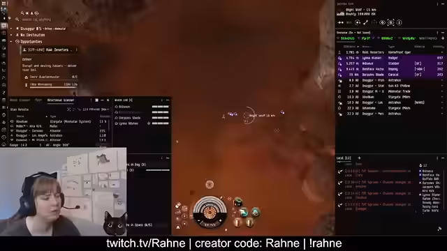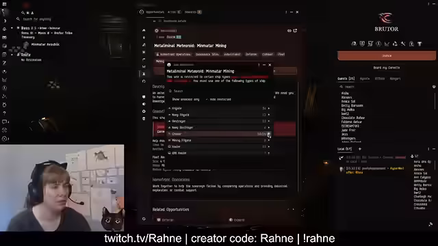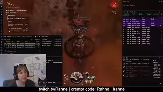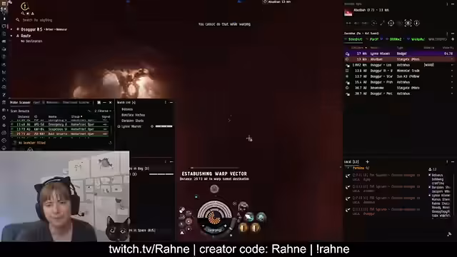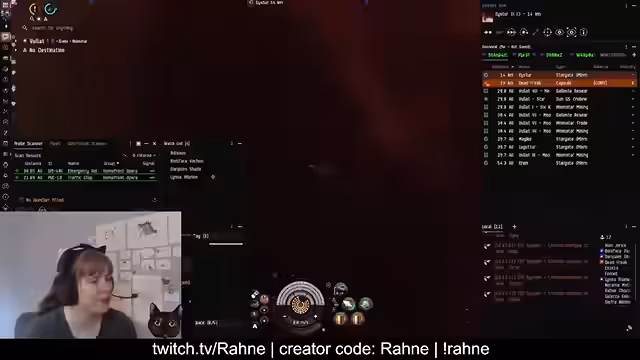 00:00:03Der Stream beginnt mit technischen Startschwierigkeiten, die nach etwa 30 Sekunden behoben sind. Streamerin Rahne stellt sich und ihre EVE-Online-Karriere vor. Sie spielt seit 2014 und streamt seit 2015. Sie beschreibt sich als soziale Person, die sowohl Solo-PvP als auch Logi in Flotten betreibt, und betont, dass sie keine CSM-Kandidatin ist, sondern sich lieber mit Hilfe ihrer Community in der Spielwelt zurechtfindet.