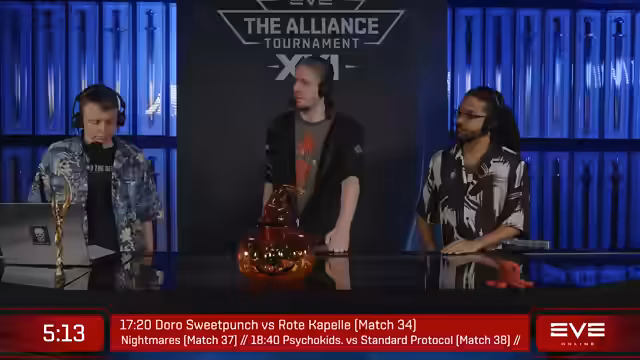 00:02:38Der Tag 2 des Alliance Tournament 21 beginnt mit den Kommentatoren CCPOverload, MysticalMight und BlackBarkPyre, die viele Raumschiffe-Explosionen ankündigen. Der Fokus liegt zunächst auf dem oberen Bracket, während Truth on the Light nach einer überraschenden Niederlage im unteren Bracket verbleibt. Die Defending Champions Tusker School werden als Favoriten genannt, während die Laserhawks durch den Mercenary Dujek OneEye verstärkt wurden und als starke Konkurrenten gelten.