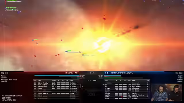 07:39:38Nach dem Spiel erläuterte CCP die Funktionsweise der neuen Turnier-UI. Die Anzeige zeigt den Match-Timer, angewandte Effekte wie Neut, Scram, Web und Damp und die Gesundheit der Schiffe. Die drei farbigen Leisten am oberen Rand des Bildschirms repräsentieren den Status der taktischen Kontrolle der Teams. Eine volle Leiste (z.B. bei Tuskers) bedeutet maximale Kontrolle durch Module wie Damps, die die Reichweite und Fähigkeiten der gegnerischen Schipse einschränken. Diese Kontrolle ist der Schlüssel zum Erfolg, da sie es dem Gegner unmöglich macht, seine Ausrüstung effektiv zu nutzen und Manövrierfähigkeit verliert. Die UI ist für neue Spieler eine wichtige Lernhilfe.