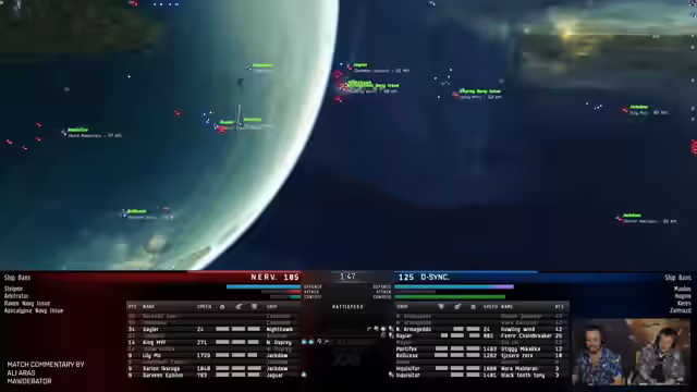 06:13:33Die Analyse des Matches zwischen NERV und D-Sync zeigt ein taktisches Duell. Während beide Teams ähnliche Zusammensetzungen mit Schlachtschiffen einsetzten, wählte NERV zwei Navitas anstelle von zwei Deacons, um einen Curse und einen Celestis zu integrieren. Die Schlüsselentscheidung war der frühe Angriff von D-Sync auf den Curse von NERV. Dieser strategische Zug ermöglichte es D-Sync, die Deacons von NERV ungehindert zu beschädigen und das Match zu kontrollieren. Die Koordination der Schiffe war entscheidend.