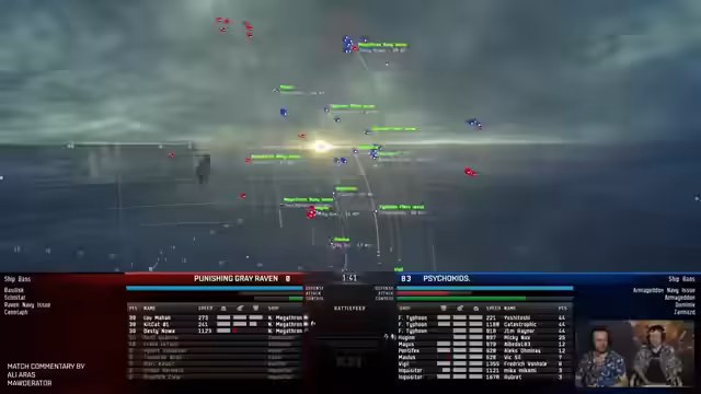 06:46:12Im Match zwischen Psycho Kids und Punishing Grey Ravens stehen sich gegensätzliche Taktiken gegenüber. Punishing Grey Ravens setzt auf einen Rush-Komp mit Navy Megatrons, um schnell zum Nahkampf überzugehen. Psycho Kids antwortet mit einem Kite-Komp, der auf Cruise Typhoons und einem Huginn zum Beschleunigen und Abfangen der Gegner setzt. Die Performance des Huginn-Piloten Mickey Knox ist dabei entscheidend für den Erfolg der Psycho Kids, da er die Gegner perfekt in Reichweite halten muss.