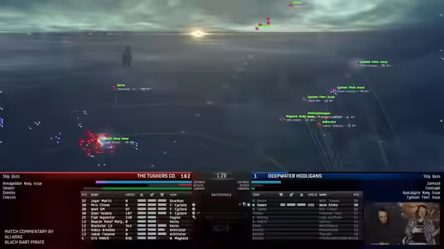 05:25:44Das Match beginnt mit Deteriorated, die Navy Apokalypsen nutzen. Barcode erleidet schnell schwere Verluste, als ihre Link-Ship-Pontifex und Magus eliminiert werden. Dies schwächt die gesamte Komposition von Barcode erheblich und entzieht ihnen den Vorteil der Kampfunterstützung. Trotzdem kämpft das Team tapfer an, doch Deteriorated nutzt ihre Navy Apokalypsen effektiv und greift mit Unterstützung eines Curse und Vexoren-Drones systematisch an. Der entscheidende Faktor war der schnelle Verlust der Logi-Links, der Barcode die Fähigkeit nahm, effektiv zurückzuschlagen.