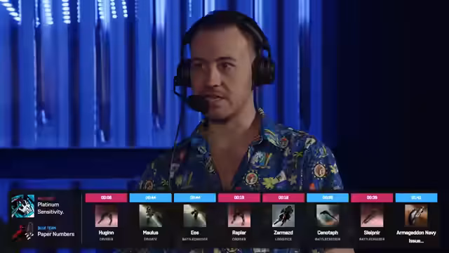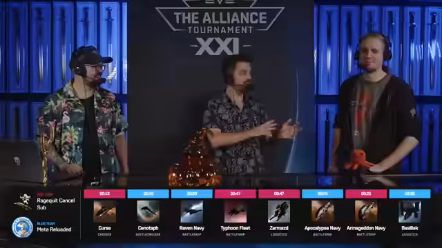 01:09:07Nach dem Match wird die zunehmende Popularität der Deacon als Logistikschiff im Turnier diskutiert. Die Kommentatoren führen dies auf die Kosten und die Punktkosten im Metagame zurück, das oft Tripleschlachtschiff-Kerne erfordert und daher die Verwendung von billigeren Tech-1-Logistikeinheiten wie der Inquisitor begünstigt. Schiffe wie der Guardian und der Oneros werden aufgrund ihrer hohen Punktkosten oft nicht genutzt. Auch die häufigen Bans von Schiffen wie der Zarmazd und der Xenotaph werden angesprochen, da Teams so unerwünschte Fähigkeiten ausblenden.