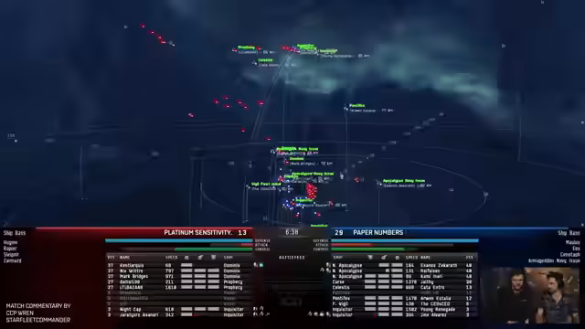 02:02:52Platinum Sensitivity bringt Triple Dominix mit Vexors (bekannt als 'Potato Salad'), während Paper Numbers mit drei Navy Apocs und einer Curse antreten. Die Bans umfassen den Zarmzad, da er zu starken Reparaturleistungen führt. Platinum Sensitivity nutzt Sentries, verpasst aber die notwendige Kontrolle, um die Navy Apocs effektiv zu bekämpfen. Paper Numbers dominiert durch bessere Positionierung und Schadensverteilung, wodurch Platinum Sensitivity in die Eliminierungsrunde rutscht. Paper Numbers sichert sich damit Prize Ships und Top-12-Platzierung.