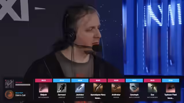 02:23:43Der Fokus verlagerte sich auf das nächste Match zwischen Barcode und Odin's Call. Die Analyse der Banns zeigte, dass beide Teams strategisch vorgingen: Odin's Call bannte den Typhoon Fleet Issue, um die Navy Apocs offen zu halten, während Barcode den Slepnir, Arbitrator und Navy Apoc bannte, um Rush- und Kite-Setups zu schwächen. In der Arena landete Odin's Call mit drei Navy Torp Ravens bei Null, während Barcode mit einem Flag-Balgorn, Dominixes und einer Kontroll-Aufstellung antrat. Die Schlacht begann sofort, als die Torp Ravens des blauen Teams den Balgorn unter massiven Feuer setzten und ihm binnen kurzer Zeit erheblichen Schaden zufügten.