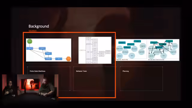 00:25:31Es werden die drei klassischen Ansätze für NPC-KI vorgestellt: Endliche Zustandsautomaten, die in Spielen wie Half-Life verwendet werden, Verhaltensbäume als Industriestandard (popularisiert durch Halo) und AI-Planer. Letztere gelten als ideal für komplexe Entscheidungen sind, aber für EVE Frontier aufgrund der bestehenden Systemarchitektur unpassend und aufwendig in der Implementierung.