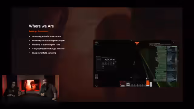 00:55:28Ein entscheidender Meilenstein ist, dass die Feral Drones nun die Umgebung und Inventare anderer Spieler scannen können. Dies ermöglicht völlig neue Interaktionsmöglichkeiten. NPC-Gruppen teilen sich Informationen, was zu komplexerem Verhalten führt, anstatt wie zuvor auf ein einziges Ziel zu fokussieren. Die Entscheidungsfindung basiert auf einem flexibleren, interessensbasierten Punktesystem anstelle starrier Regeln.