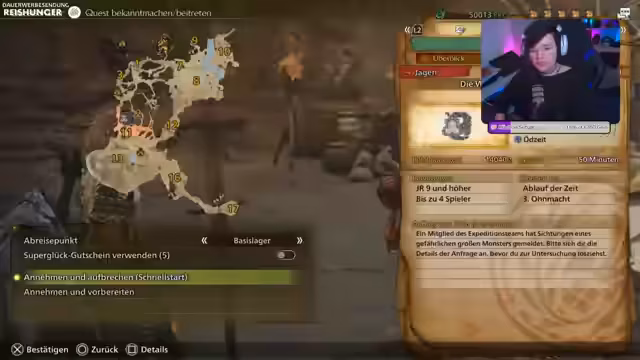 04:42:48Die Streamerin diskutiert über das Geldfarmen im Spiel und erklärt, dass es am einfachsten ist, alleine Monster zu kloppen, da man dann mehr Geld bekommt. Sie ermutigt die Zuschauer, Hilfe anzufordern, wenn sie Quests benötigen. Sie spricht über die Gildenlobby und wie man ihr beitreten kann. Sie findet es schade, dass der Geld-Pott aufgeteilt wird, wenn man mit anderen spielt. Sie erwähnt, dass sie abends gerne mit ihrem Mann alleine unterwegs ist, da es dann mehr Geld gibt. Sie überlegt, Ressourcen zu verkaufen, um an die eine Million Trophy zu kommen, findet die Idee aber schrecklich. Sie vergleicht es mit dem Skippen von Storys in FFXIV und sagt, dass man das einfach nicht macht. Sie freut sich auf das Genießen der Sonne und etwas Essbares. Sie markiert ein Monster dreimal für später, wenn sie es braucht. Sie stellt fest, dass sie wenig Ressourcen hat und sucht nach einem gehärteten Gypkeros, den sie aber nicht benötigt. Sie öffnet die Karte und muss erst die Umgebungsinfos skippen, bevor sie die Karte öffnen kann. Sie fragt Gemma, ob sie ihr etwas Geld geben kann, um ihre Ausrüstung zu verbessern. Sie stellt fest, dass sie nicht genug Geld hat, um sich viel zu craften.