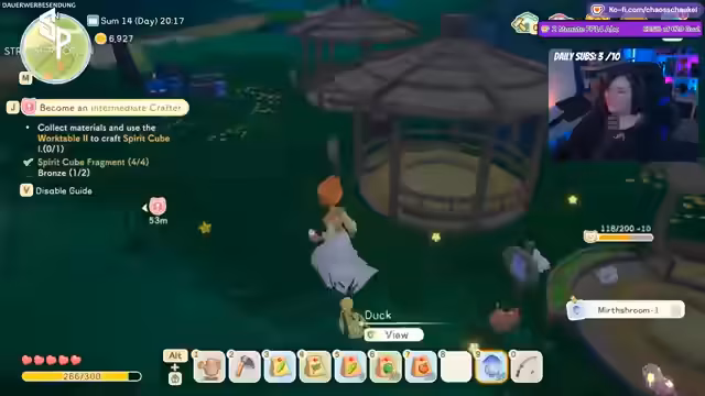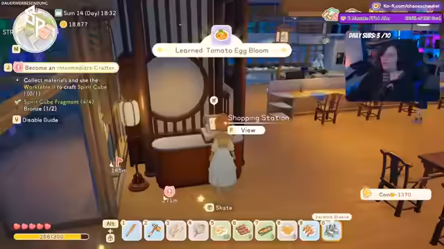 03:21:33Nachdem nun fast alles für den Start von Mini Chaos beisammen ist, wird die fehlende Wickeltragetasche noch bei Gatepoint besorgt. Neue Rezepte fürs Kochen wurden ebenfalls erlernt und ein roter Fisch, der morgen angeboten werden soll, wurde gekauft. Für die Tierzucht wurde eine bessere Futterstation gebaut, wobei das neue Futter die Tiere glücklicher macht, aber erst bei neuen Tieren benötigt wird. Die fehlende Werkbank und ein Rätselgegenstand (Spirit Cube Fragment) aus dem Wald sind die nächsten Craft-Ziele.