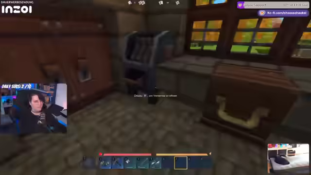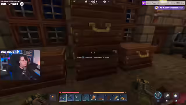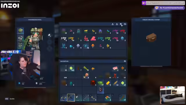 03:58:29Der Streamer entdeckt, dass es sich lohnt, Kisten in der Spielwelt zu plündern. Er findet neben Fleischspießen auch hübsche Dekorationsgegenstände wie ein Bücherregal, das er mitnimmt. Sein Inventar füllt sich jedoch zusehends, weshalb er beschließt, zur Basis zurückzukehren, um die gesammelten Ressourcen zu lagern und den Fund eines Entvogens anzugeben.