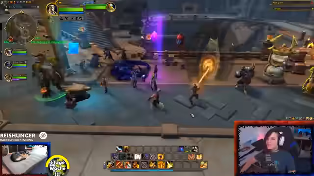 01:34:49Der Stream startet mit der Erkundung neuer Phasenstürme, die als tägliche Quests absolviert werden müssen. Um an der Event-Quest teilzunehmen, werden zunächst Gruppenmitglieder gesucht, um den großen Drache Rechanor zu besiegen, der den ungebundenen Raum nutzt. Beim Kampf gegen den Weltboss zeigt sich, dass Schlachtzüge in der Open World voll sind, was für Heiler sehr praktisch ist, da sie alle Spieler auf einmal heilen können. Der Streamer erfährt bei FPS-Problemen, dass eine starke CPU und reduzierte Zauber-Effekte die Performance verbessern können.